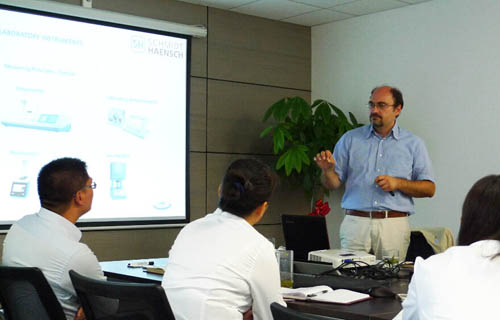 2014年9月22日,適逢慕尼黑上海生化分析展開展前夕,德國SCHMIDT+HAENSCH(施密特-漢熙,簡稱S+H)公司產(chǎn)品經(jīng)理Nebojsa Francuski來到利曼中國上海辦,為利曼的銷售精英們進(jìn)行了系統(tǒng)的產(chǎn)品培訓(xùn)。