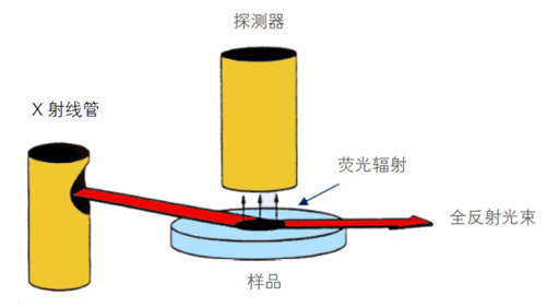 全反射X熒光光譜技術(TXRF)基于X 熒光能譜法(EDXRF),但與能譜分析有著明顯的區(qū)別:傳統(tǒng)EDXRF采用原級X光束以45°角轟擊樣品,而TXRF采用毫弧度的臨界角入射。由于采用此種近于切線方向的入射角,原級X光束可以被反射,照射在樣品表面后,可以很大程度上避免樣品載體吸收光束和減小散射的發(fā)生,同時減小了載體的背景和噪聲,亦可減少樣品使用量。