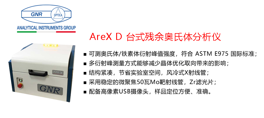 意大利GNR品牌 AreX D 臺式殘余奧氏體分析儀,符合ASTM發布的E975標準方法:X射線法測量近無規結晶取向鋼中殘余奧氏體的含量,及即將實施的 JB/T 14006-2020 標準。同時,AreX D 為專用的奧氏體分析儀,無需在傳統XRD基礎上再進行復雜調試,即開即用,可快速獲取測量結果。
